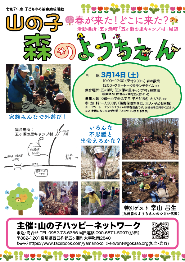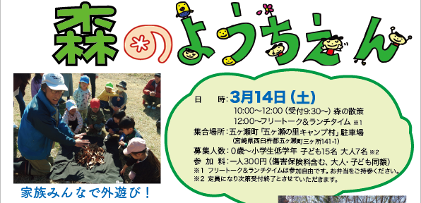 山の子ハッピーネットワークでは、3月14日(土)に五ヶ瀬の里キャンプ村周辺で、森のようちえんを開催します。 今年もなかなか寒い冬でしたね! 子どもたちは寒さに負けずにお外で遊んでいますか? もうすぐ、暖かくなってくれるか