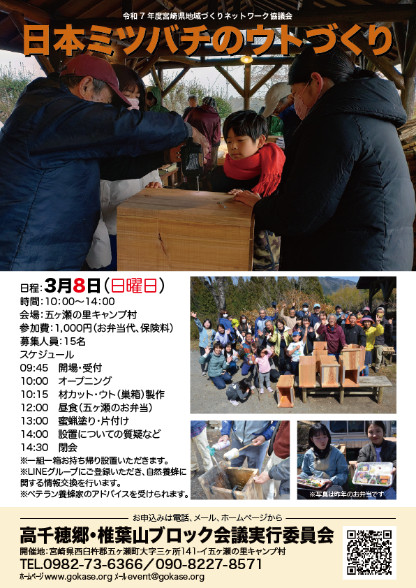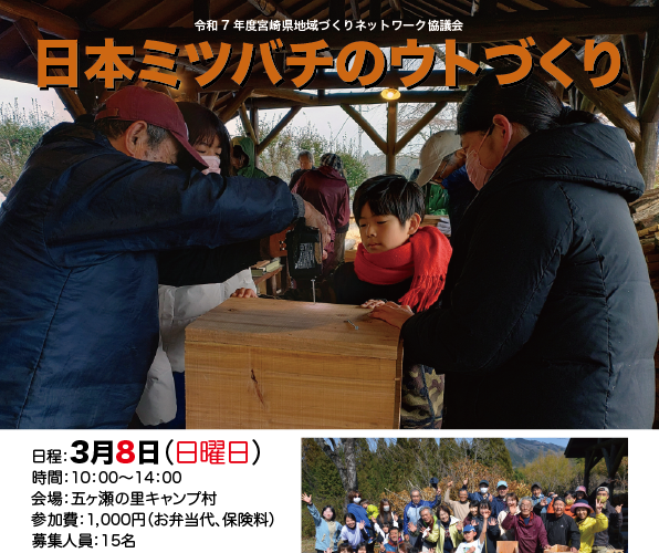 宮崎県地域づくりネットワーク協議会高千穂郷・椎葉山ブロック会議実行委員会では、 2026年3月8日に日本ミツバチのウト(巣箱)づくりワークショップを行います。 蜂蜜という言葉は日本書紀にも書かれおり、古くから貴重な物とし